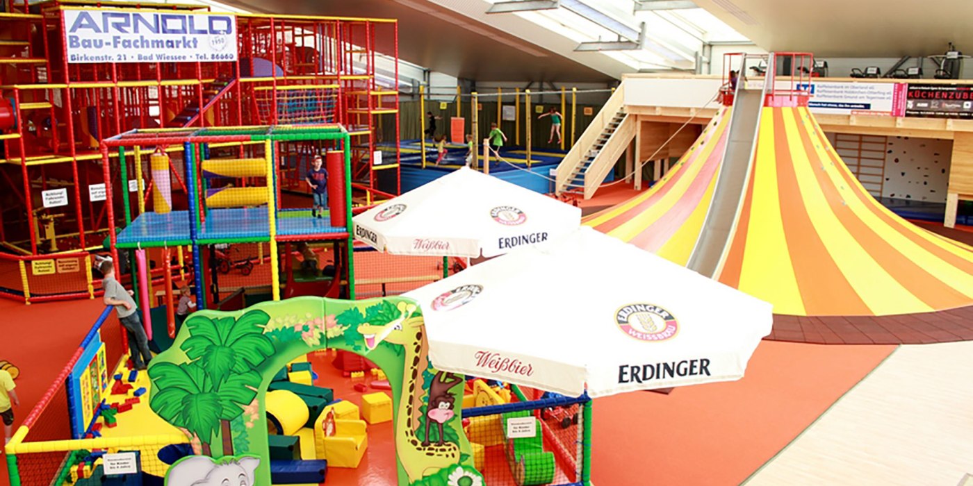 The play and sports arena at Tegernsee is the largest indoor play park in the Oberland. Before the eyes of the little visitors lies a huge adventure landscape that invites them to play and romp around. Whether climbing labyrinth, climbing volcano, trampoline, go-kart track, toddler area, soccer field, bouncy castle, table football, air hockey, table tennis or billiards - on over 2,000 m² children between 1 and 99 can let off steam to their hearts' content. Children's dreams come true in the play arena, all year round and in all weathers. Big or small, young or young at heart, the play arena offers fun and exercise for the whole family.